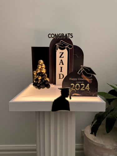 - The Staging Kit — the reusable base. The Staging Kit is purchased once and used for every theme. It includes the light-up cake stage and the acrylic backdrops that all designs attach to.