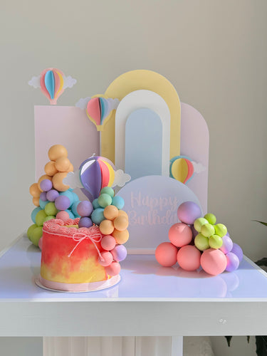A coloured theme collection which includes coloured vinyls to attach to the backdrop and matching balloon garlands. Style them as they are, or customise with characters, props and personalised name + age toppers.