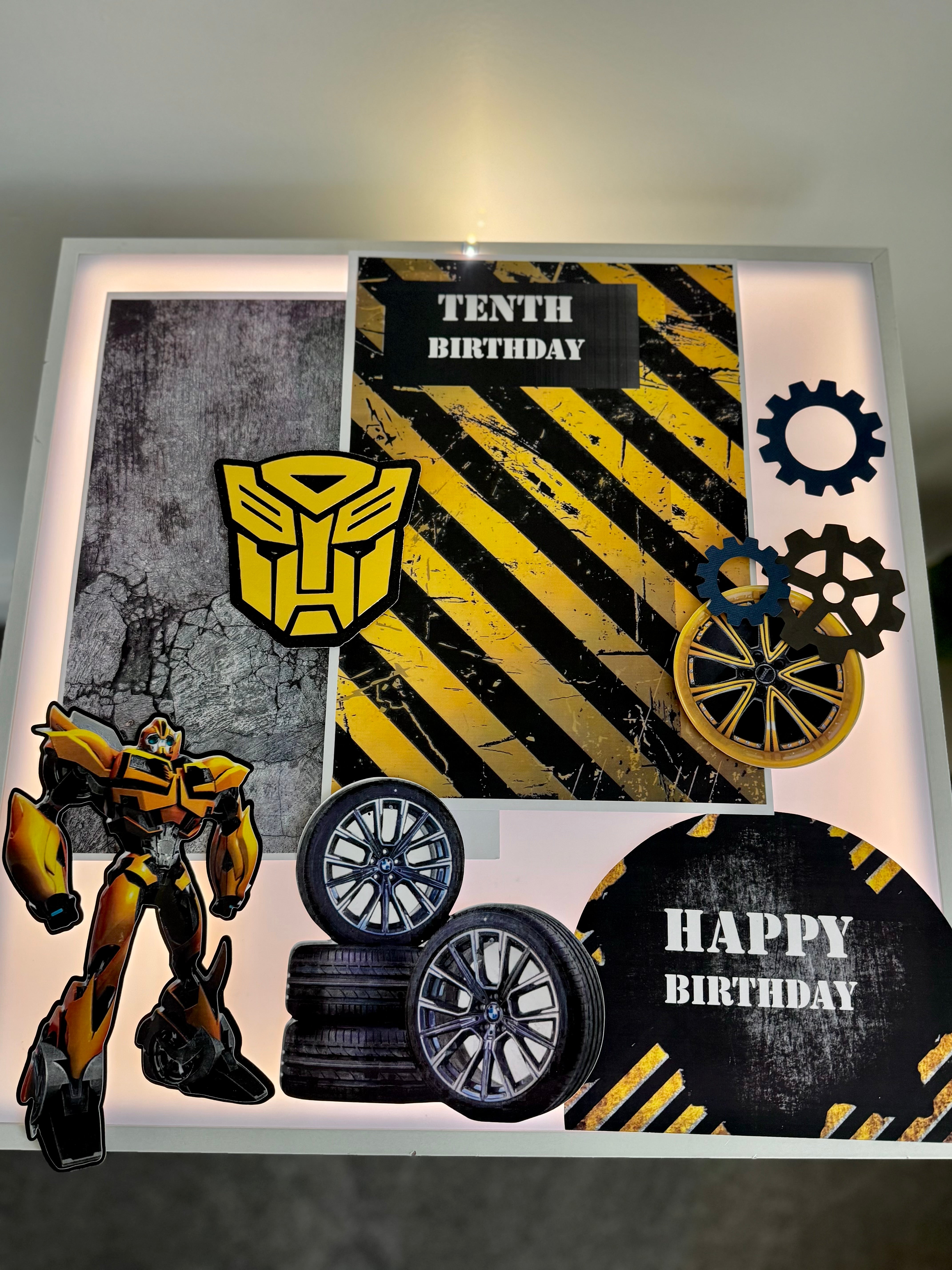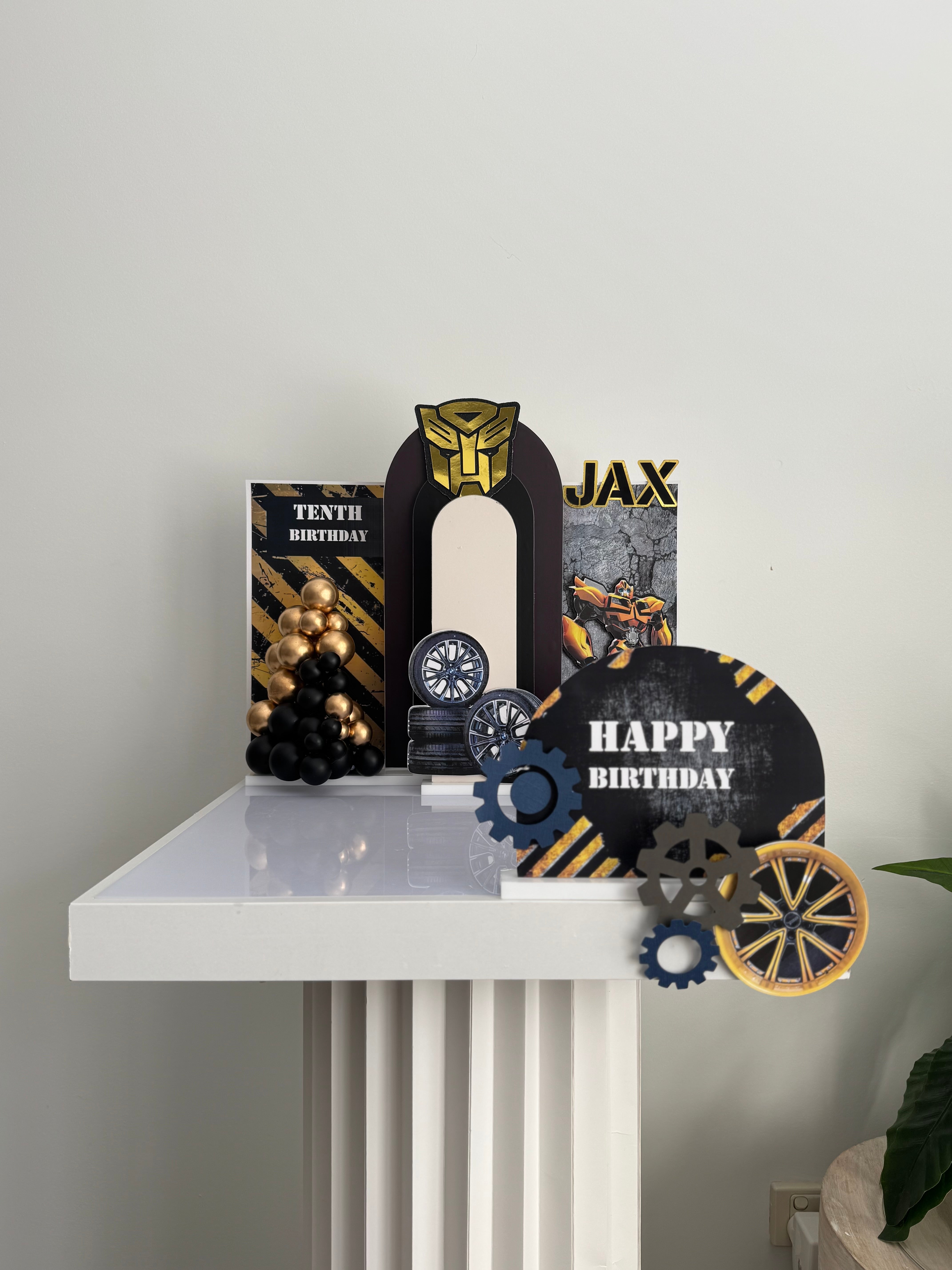 The Bumble Bee is a vibrant yellow, gold and black theme and is always a popular boys theme. This cardboard cutout set contains 8 pieces of iconic characters/symbols from the movie. The complete birthday setup depicted in the picture uses The Black Hive (sold separately) as the base theme.
