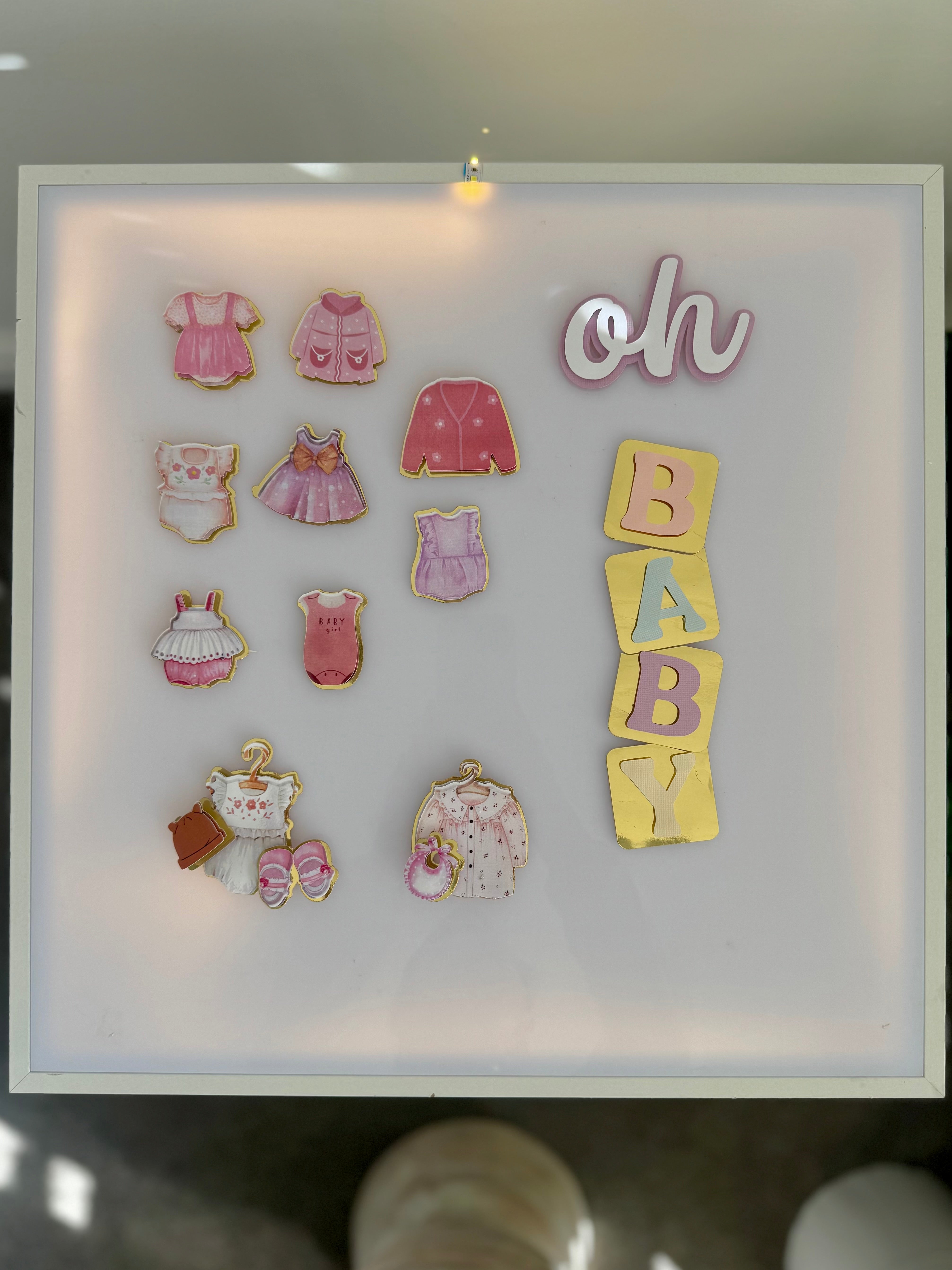 A girl baby shower theme with cardboard cutouts of baby clothes and baby blocks. This baby shower theme contains 12 pieces that complements The Pink Teddy Bear standard theme.