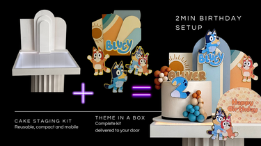 Everything you need to create a professional 2min birthday setup, reused year after year, no styling skills needed. Bundle includes reusable Cake Stage and your chosen Theme-In-A-Box.
