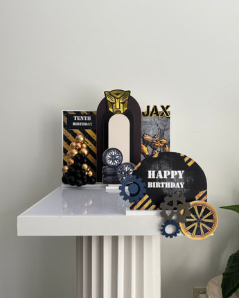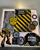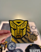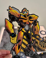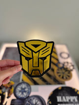The Bumble Bee is a vibrant yellow, gold and black theme and is always a popular boys theme. This cardboard cutout set contains 8 pieces of iconic characters/symbols from the movie. The complete birthday setup depicted in the picture uses The Black Hive (sold separately) as the base theme.