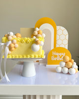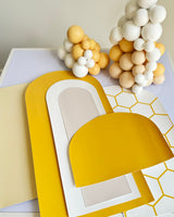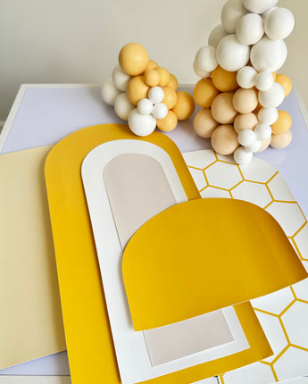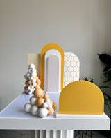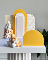 The bright yellow arches together with shades of light tone arches compliments the honeycomb backdrop. Add bee cut-outs, honey pots or even Winnie The Poo to personalise this theme!