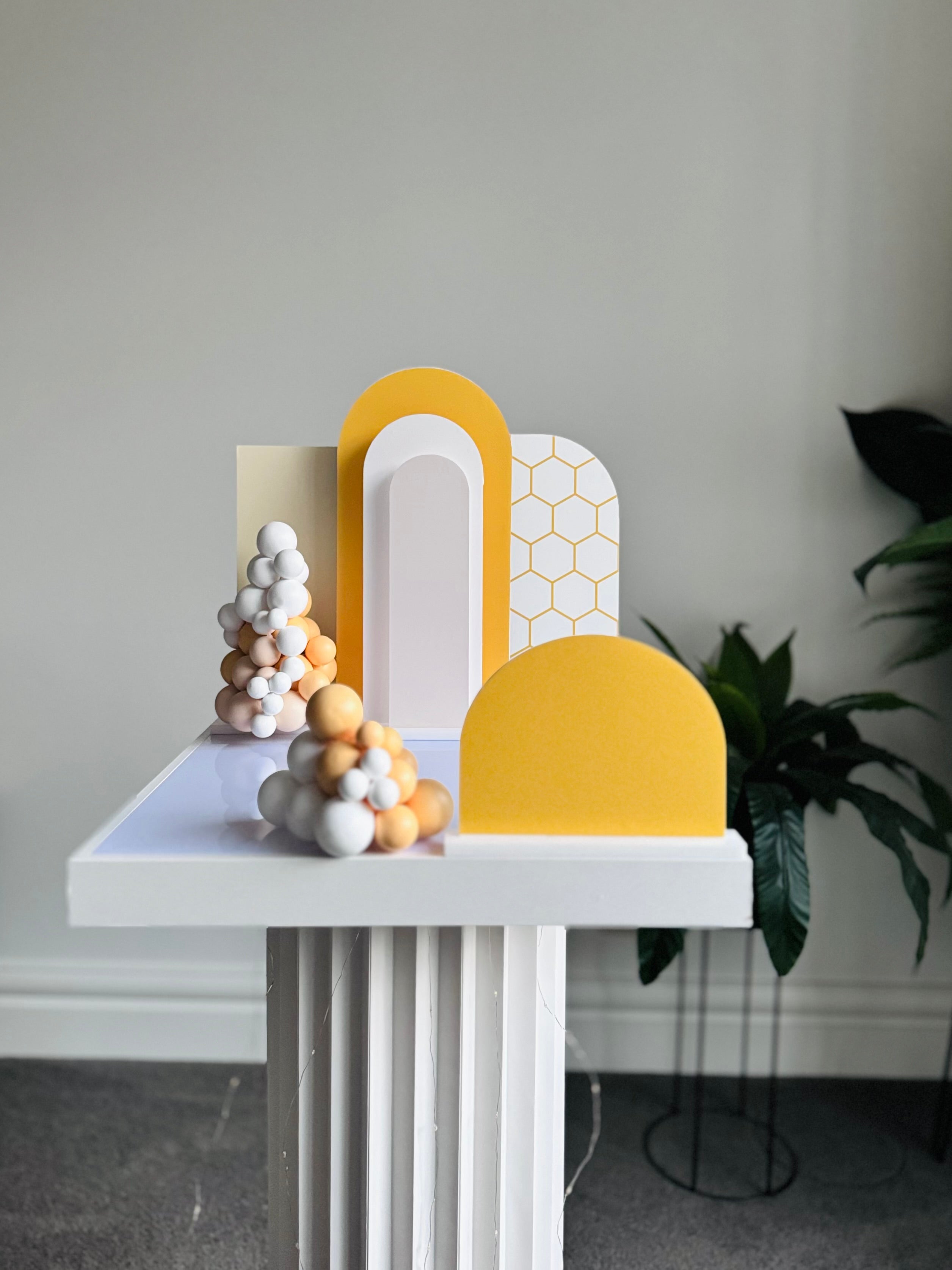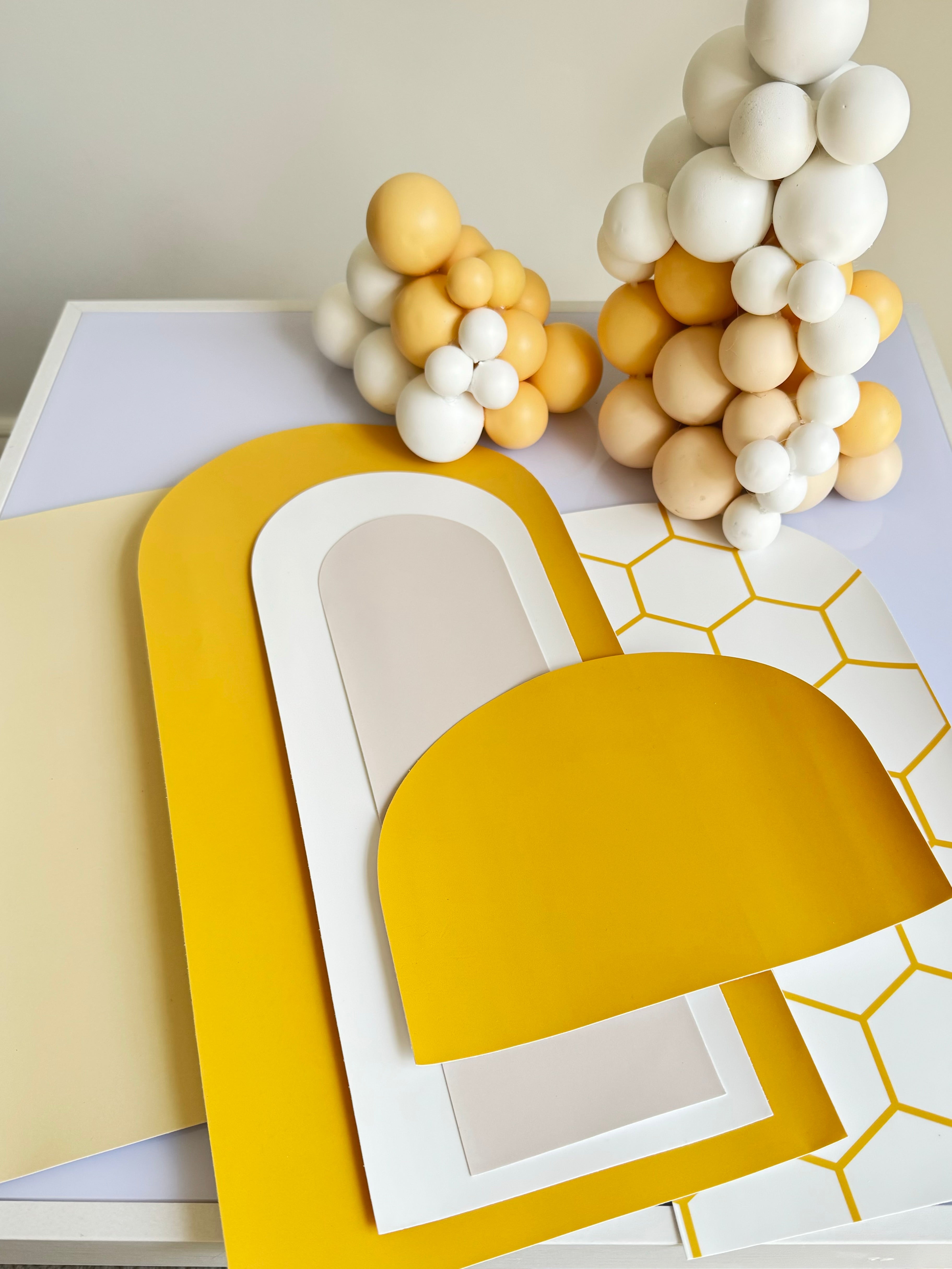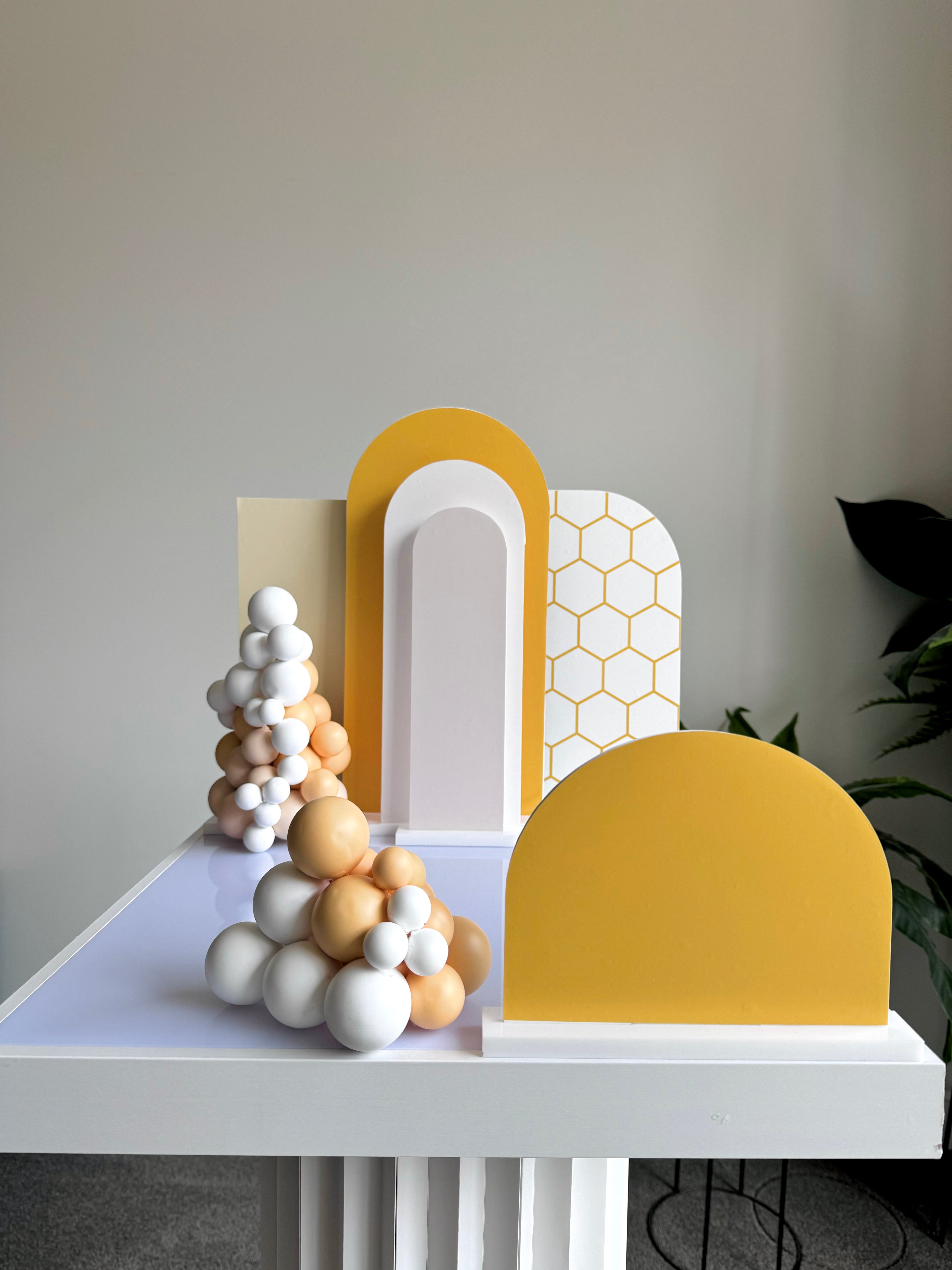 The bright yellow arches together with shades of light tone arches compliments the honeycomb backdrop. Add bee cut-outs, honey pots or even Winnie The Poo to personalise this theme!