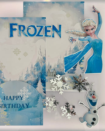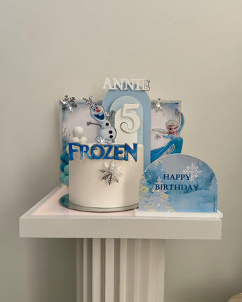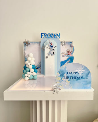 This theme in a box includes icy-blue vinyl panels, Frozen character cut-outs, and matching cake toppers designed to turn even a plain cake into a winter wonderland in minutes.