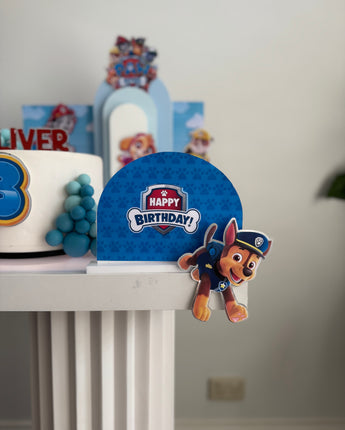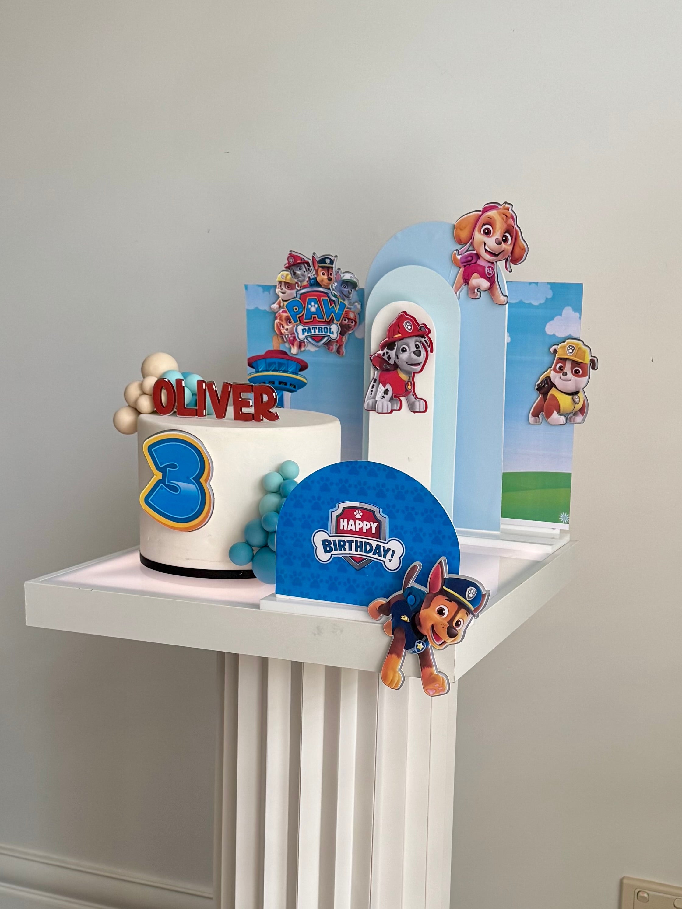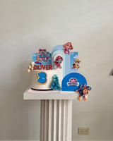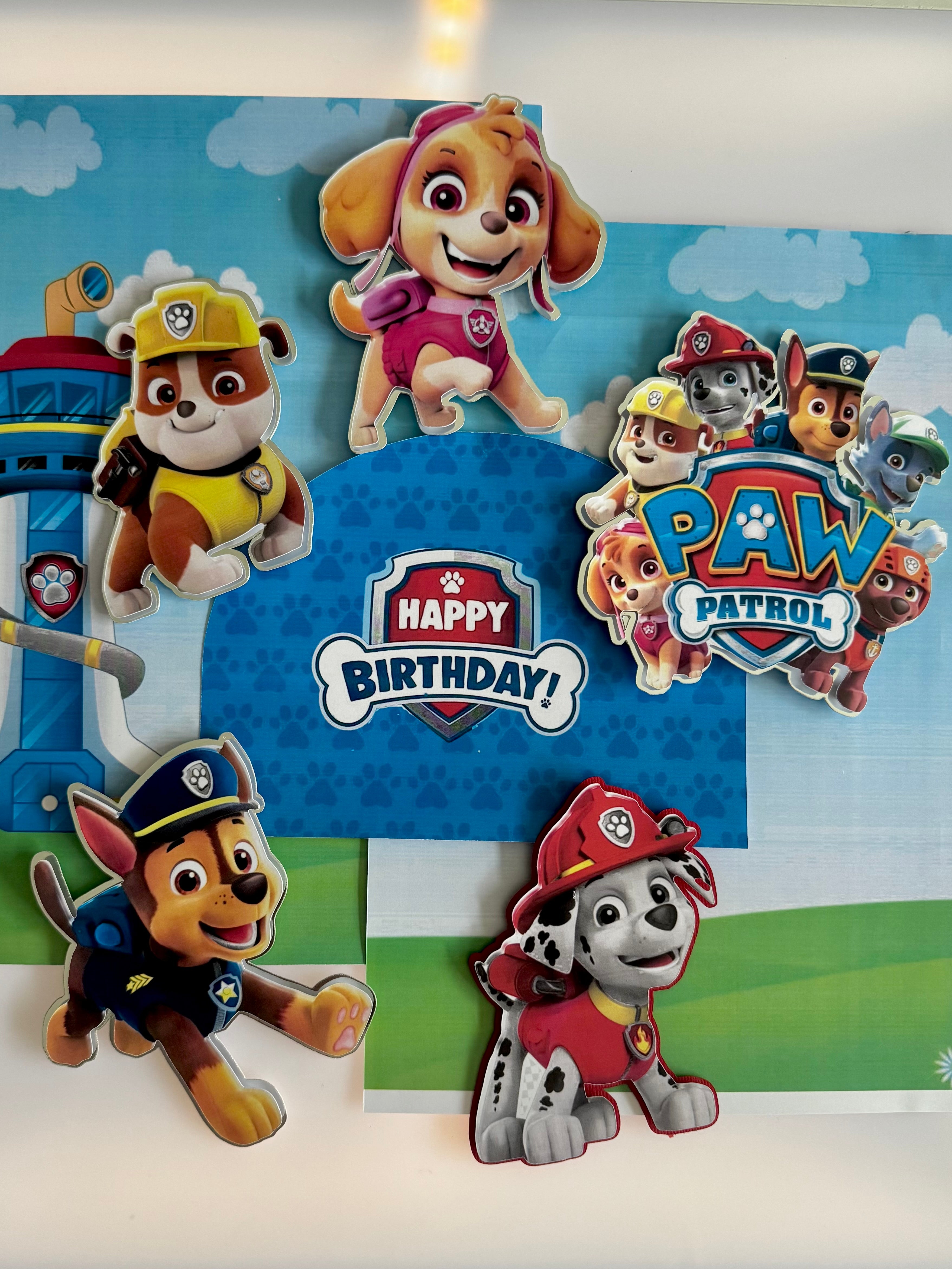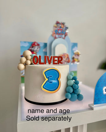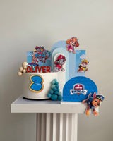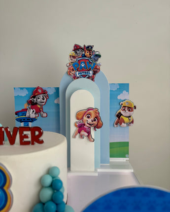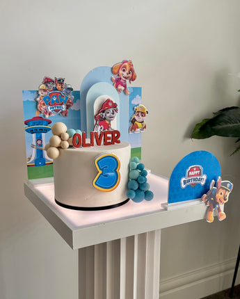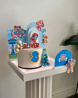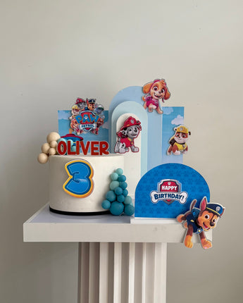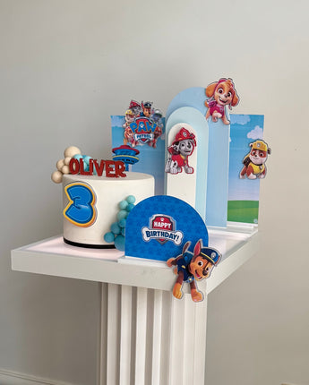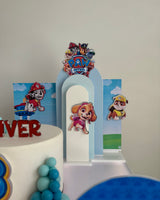 The set features everyone’s favourite Paw Patrol pups layered against sky-blue backdrops with clouds, rolling hills and the iconic Adventure Bay lookout tower — creating a bright, playful scene around your cake.