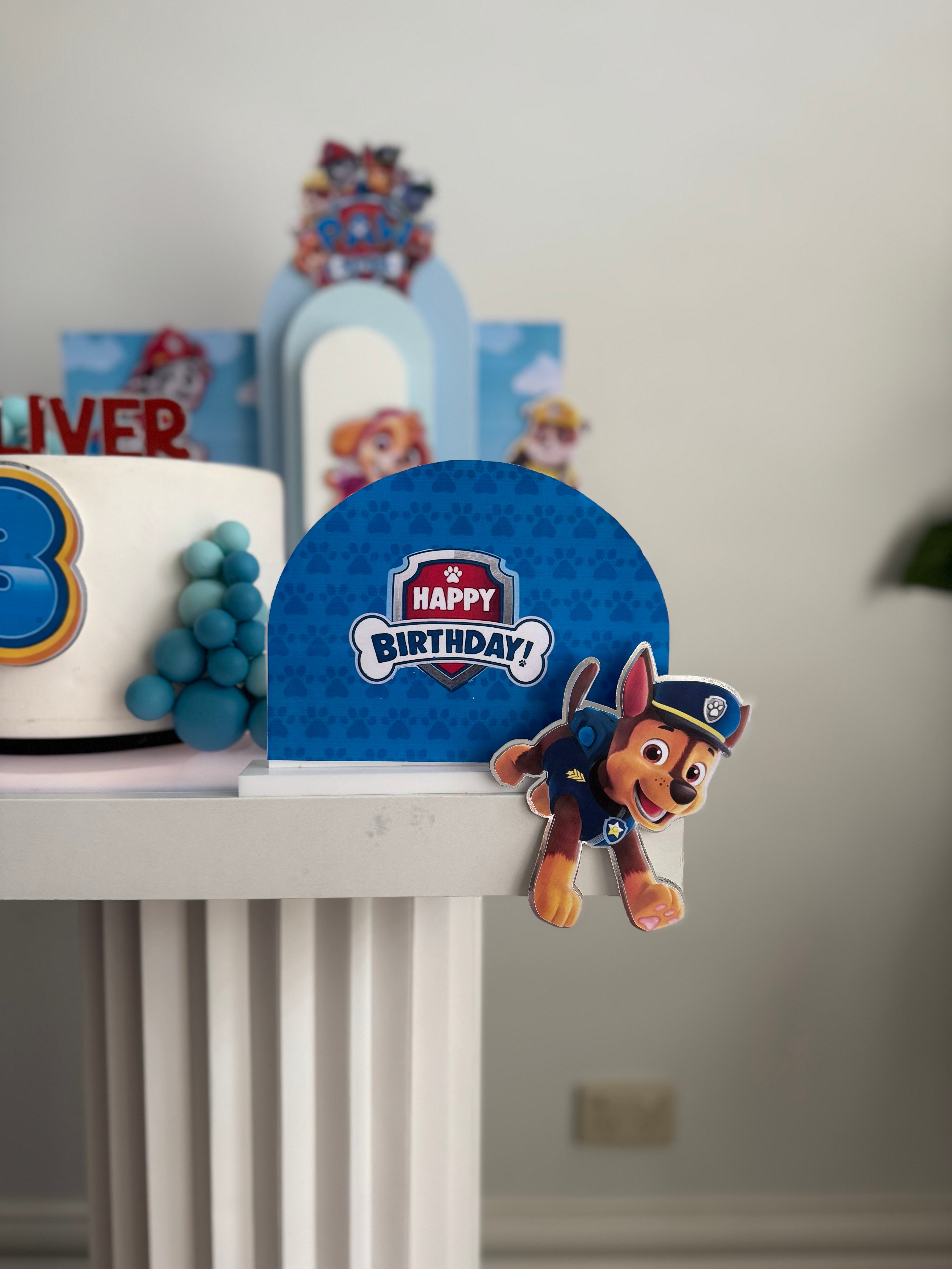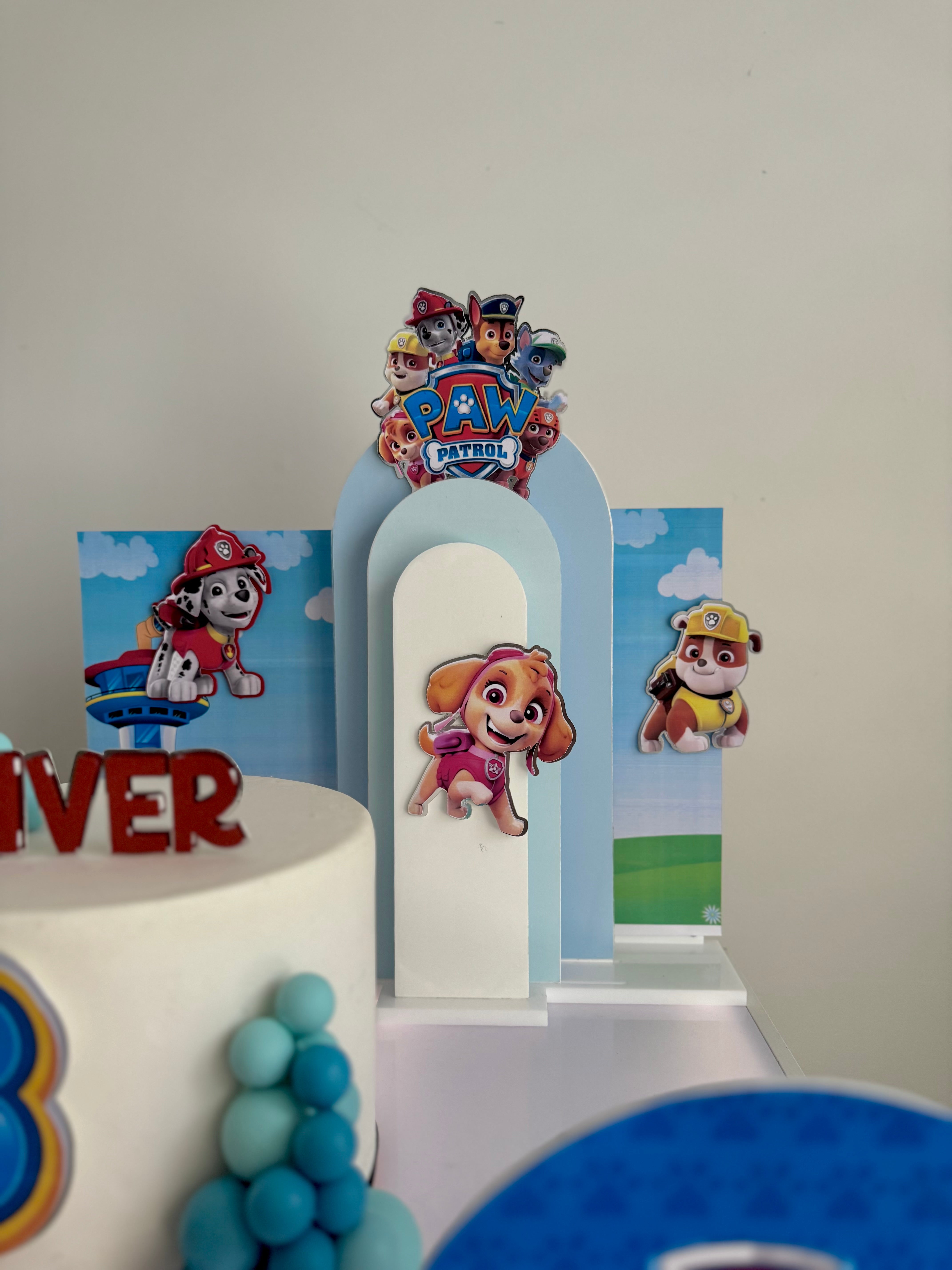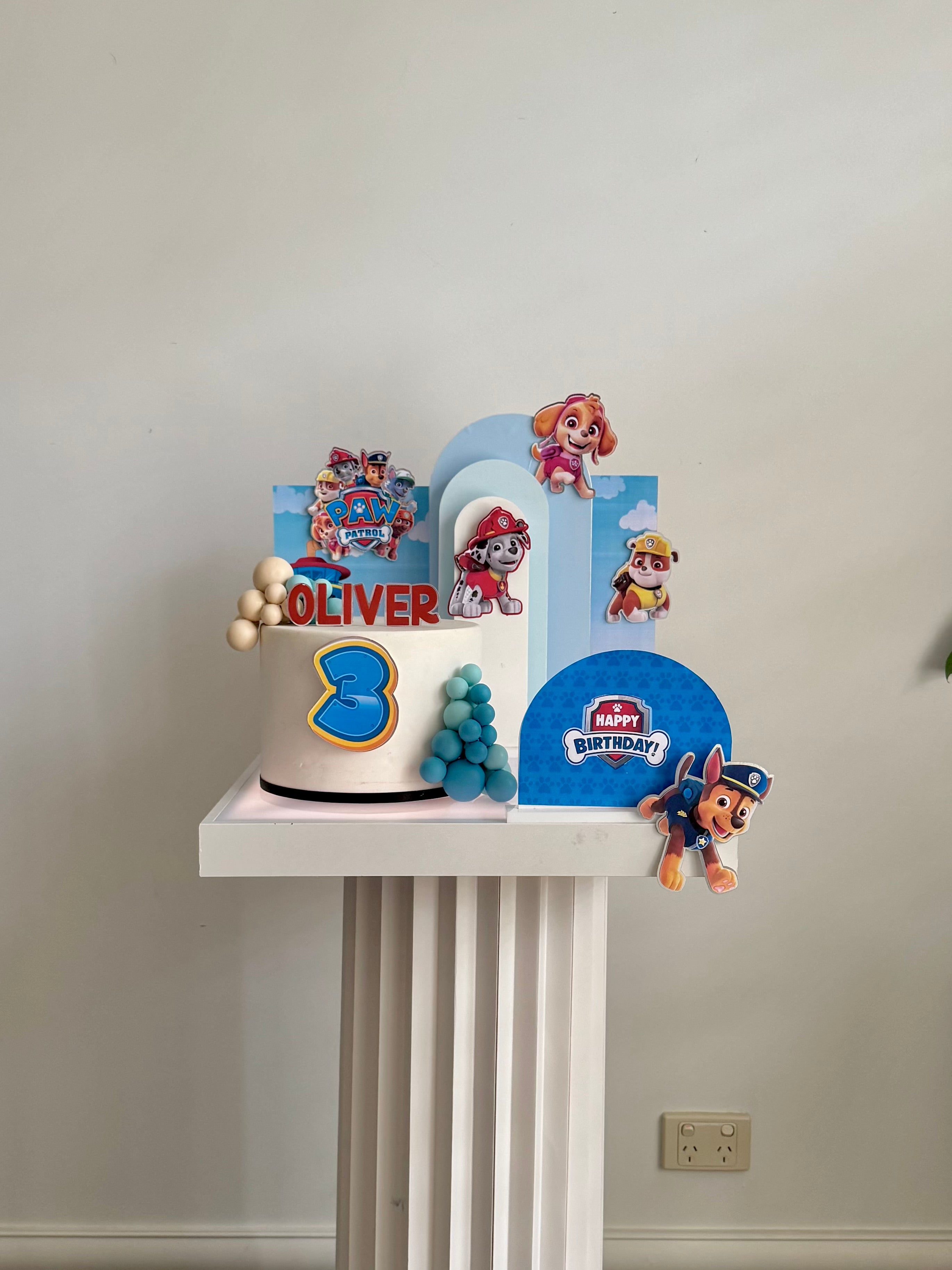 The set features everyone’s favourite Paw Patrol pups layered against sky-blue backdrops with clouds, rolling hills and the iconic Adventure Bay lookout tower — creating a bright, playful scene around your cake.