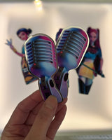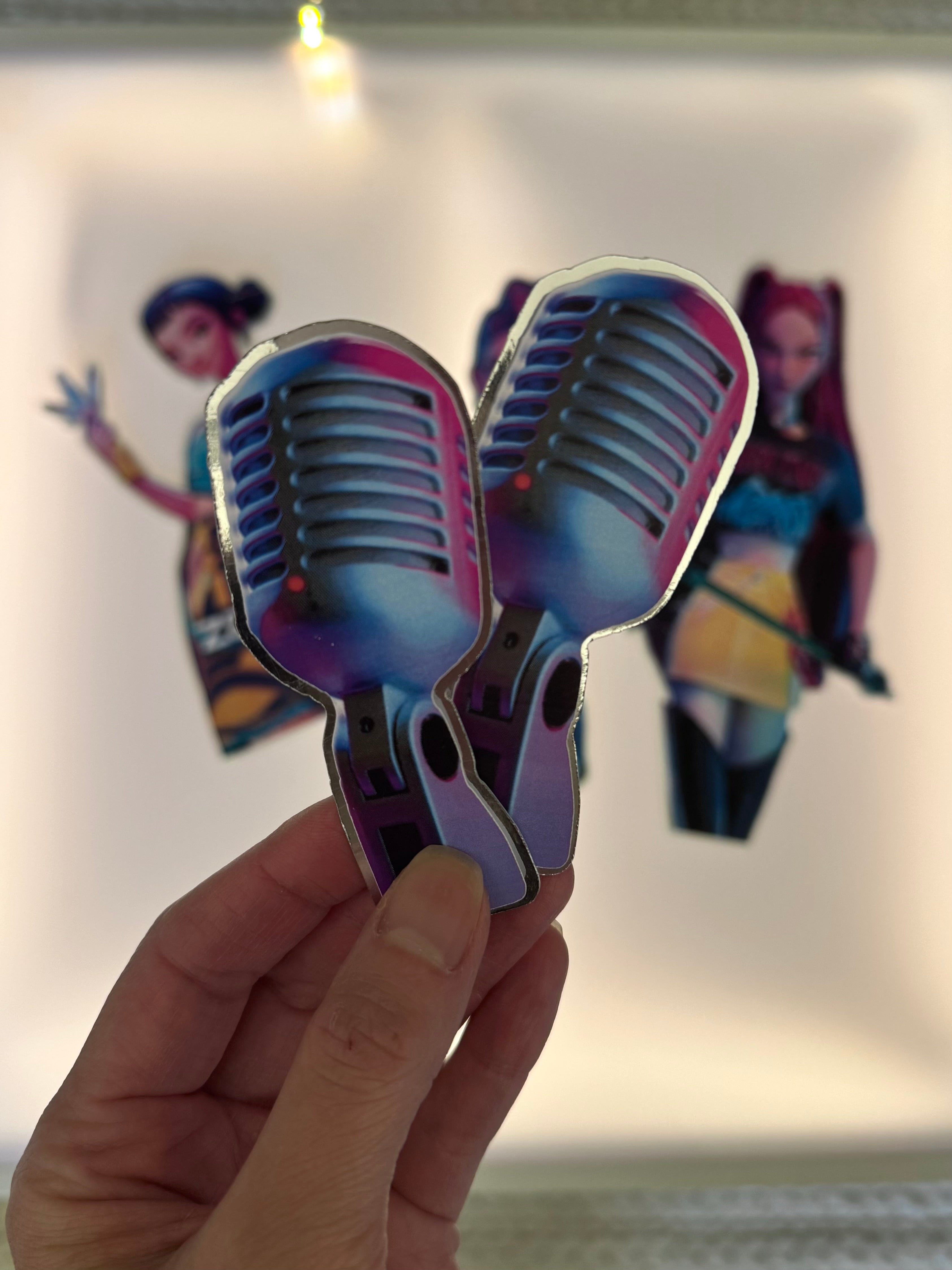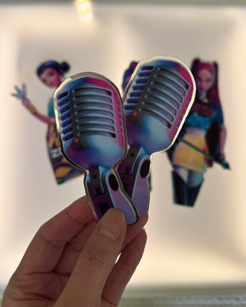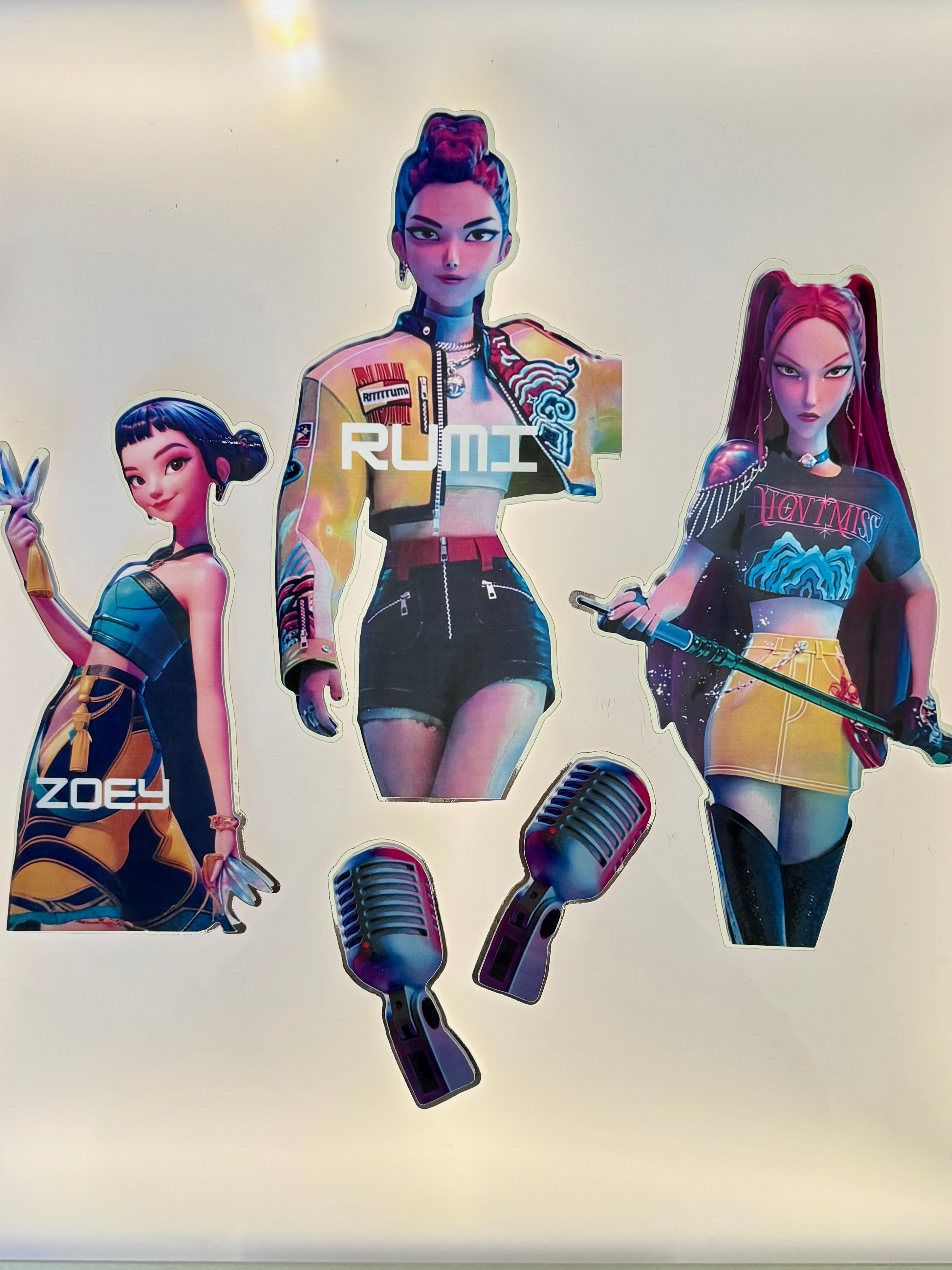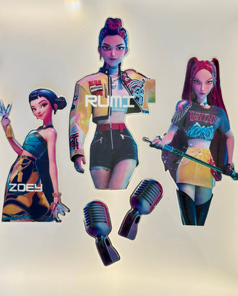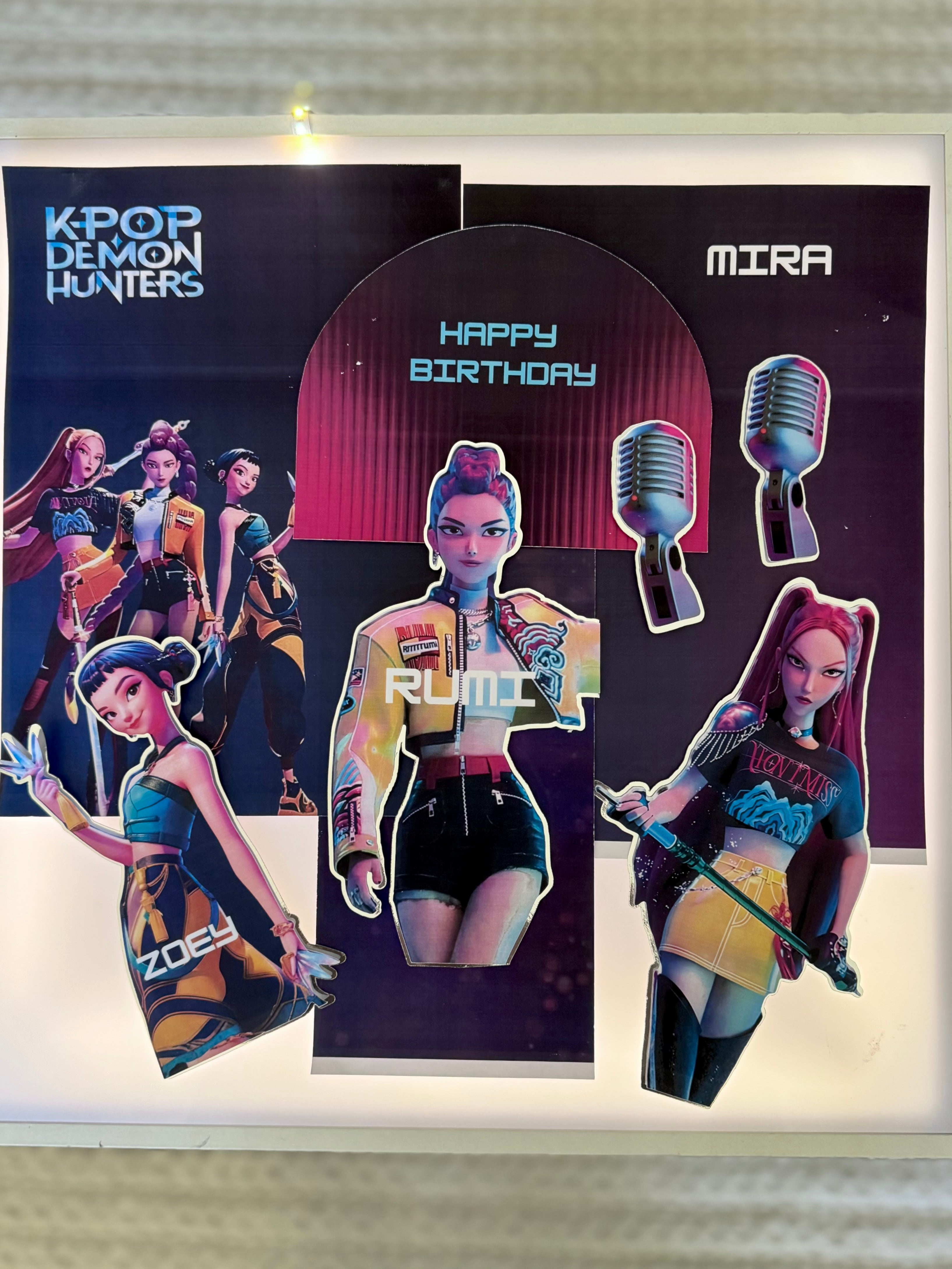 The set features movie-inspired character cutouts, microphones and the official K-Pop Demon Hunters graphics layered against electric tones of purple, pink and blue.
