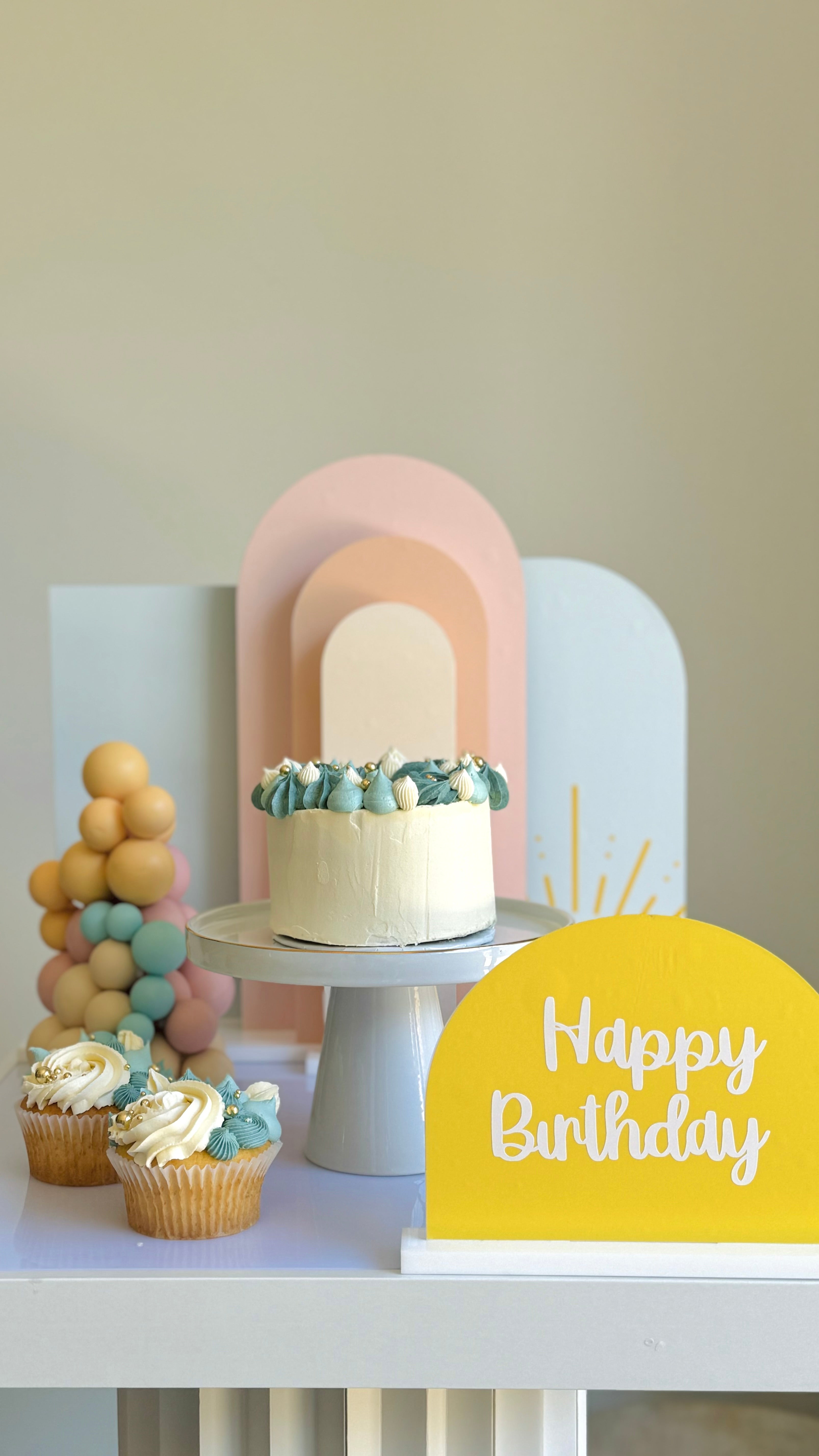 The Sunrise uses morning blue vinyls with hues of pink arches to set the tone for the yolk yellow rising sun. This theme is suitable for boys and girls and is breath of fresh air. Easy to style with any colour cake, you cannot go wrong with The Sunrise.
